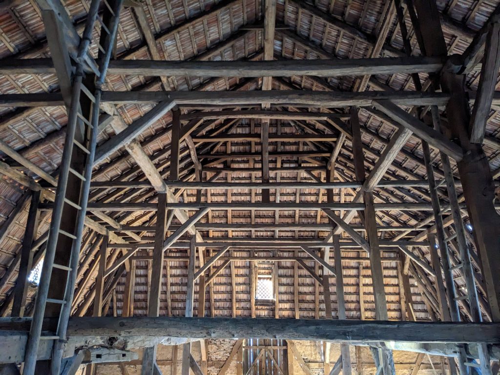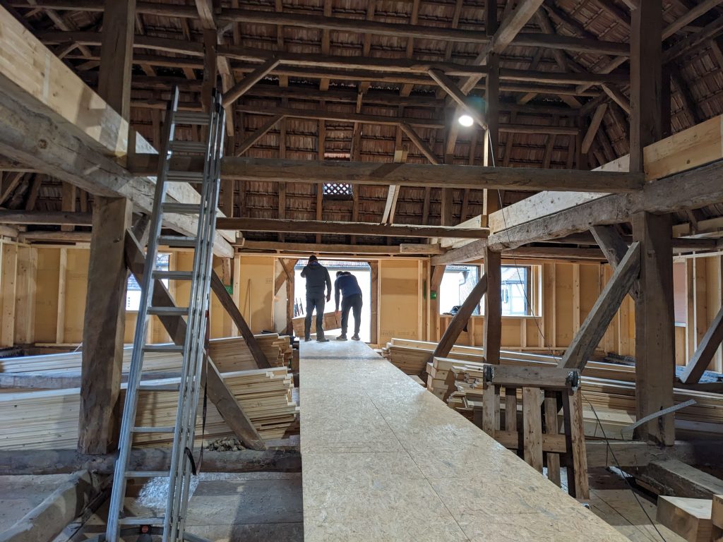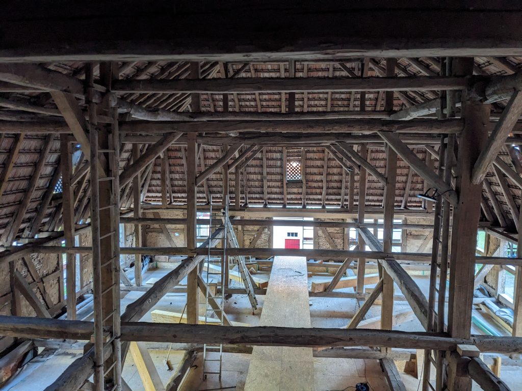 2-jährige Planungsphase, Schadensaufnahme, 3D Vermessung des vorhandenen Fachwerks, zeitintensive Abstimmung mit den Denkmalbehörden, mehrere Planungsversionen bis zur finalen Genehmigung