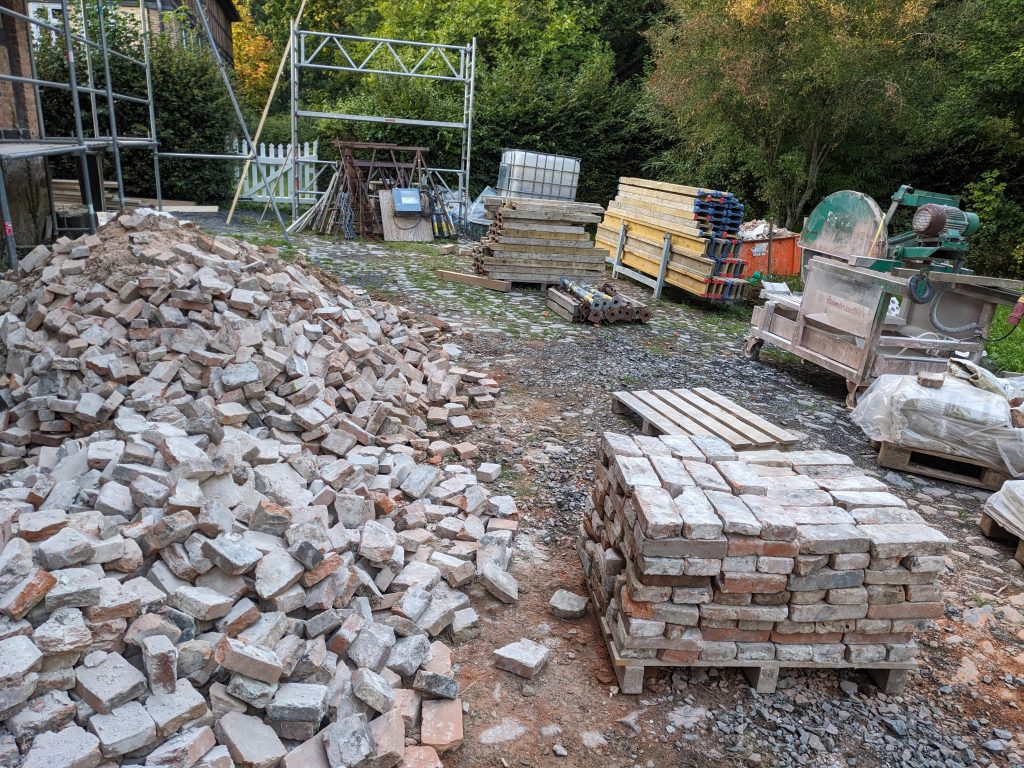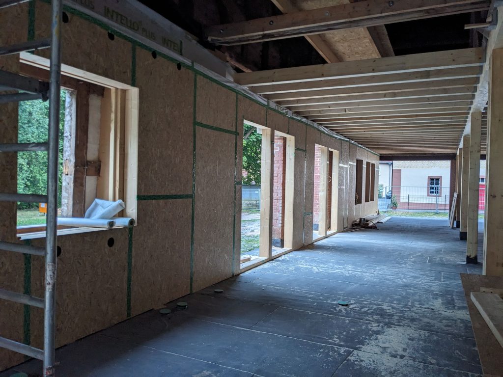 Für die Fensteröffnungen wurden einzeln die historischen Feldbrandziegel entnommen und die Fachwerkriegel etwas nach unten versetzt